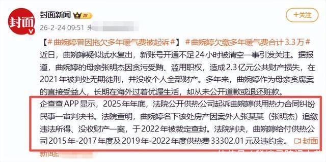 2012年,一曲《我的歌声里》让曲婉婷红遍大街小巷,她早年留学加拿大,深耕音乐领域,凭借天赋与资源成为首位签约北美顶级唱片公司的华人女歌手之一,专辑海外销量火爆,斩获多项国际音乐奖项提名,国内各大春晚争相邀请,承包多部爆款影视剧OST,被誉为“音乐才女”,事业一度风光无限。 曲婉婷的事业根基却建立在不光彩的基础之上。她的母亲张明杰曾任哈尔滨市发改委副主任、市城镇化建设领导小组办公室主任,手握重权却罔顾职责。2014年,张明杰因涉嫌贪污、受贿与滥用职权罪被羁押,经法院审理查明,2009年至2011年间,她单独受贿人民币500万元,与他人共同受贿折合人民币9317万余元,徇私舞弊、滥用职权造成公共财产损失共计人民币2.3亿余元,其中直接侵吞556名下岗职工的安置费1146万元。这些下岗职工本就生活艰难,安置费是他们养家糊口、过冬取暖的依靠,部分职工因这笔钱被侵吞,寒冬腊月连暖气都用不上。而这笔沾满血泪的赃款,大量被用于支持曲婉婷出国深造、追求音乐梦想,让她得以在海外过上优渥奢侈的生活。 面对母亲的所作所为,曲婉婷不仅毫无愧疚,还公开表示“母亲给了我最好的生活”。2021年,张明杰因贪污、受贿、滥用职权罪一审被判无期徒刑,没收个人全部财产,2022年二审维持原判。法律作出公正判决后,曲婉婷始终滞留海外,不回国配合案件调查,不退还一分赃款,也未向受害职工道过一句歉,反而多次在社交平台为母亲喊冤,将贪腐罪犯美化成“英雄”“被冤枉的好人”。这种颠倒黑白、漠视苦难的态度彻底激怒全国人民,曲婉婷被国内市场全面抵制,音乐作品全线下架,演出合作全部终止,账号被限制,成为全民公认的劣迹人物。 2026年春节刚过,曲婉婷试图低调回归国内市场。2月21日,一个认证为原创音乐人的曲婉婷账号在短视频平台上线,她身穿红色衣服录制弹唱视频,发布新春拜年内容,视频中一派岁月静好的模样,仿佛过往丑闻从未发生。她还公开宣布将于当年7月推出全新个人专辑,同时火速开通商品橱窗,明显筹备直播带货变现,意图悄悄洗白、重新捞金。 账号被封后,舆论不仅没有平息,反而持续发酵。全网呈现出罕见的一边倒态势,网友立场高度一致,坚决抵制曲婉婷复出,绝不原谅。大家抵制的并非单纯的歌手,而是贪腐的既得利益者,是花着下岗职工血汗钱却毫无愧疚的冷漠之人。这些年,曲婉婷在海外持续晒生活、晒音乐、晒自由,而那些被侵吞安置费的职工不少仍在艰难生活,这种鲜明对比让网友无法接受她回国圈钱,曲婉婷的口碑彻底崩盘,在国内再无翻身可能。 屋漏偏逢连夜雨,就在账号被封、舆论沸腾之际,曲婉婷的另一桩丑闻被曝光。法院公开的供用热力合同纠纷民事一审判决书显示,曲婉婷名下位于哈尔滨的一处高档房产,拖欠2015年-2017年度及2019年-2022年度共7个供暖季的供热费33302.01元,供热公司无奈之下将其告上法庭,法院判决曲婉婷全额支付供热费与违约金。 这一消息再次激怒网友,当年正是张明杰侵吞职工安置费,导致大量下岗职工没钱交暖气费、寒冬受冻,而曲婉婷享受着赃款带来的优渥生活,却连几万块暖气费都刻意拖欠,直至被起诉判决,这种行为撕下了她最后一层体面伪装,坐实了其自私自利、漠视规则、毫无担当的本性。3.3万元对长年在海外过优渥生活的曲婉婷而言微不足道,她却执意拖欠,这一行为成为网友口诛笔伐的最新铁证,也让她所有洗白的努力化为泡影。